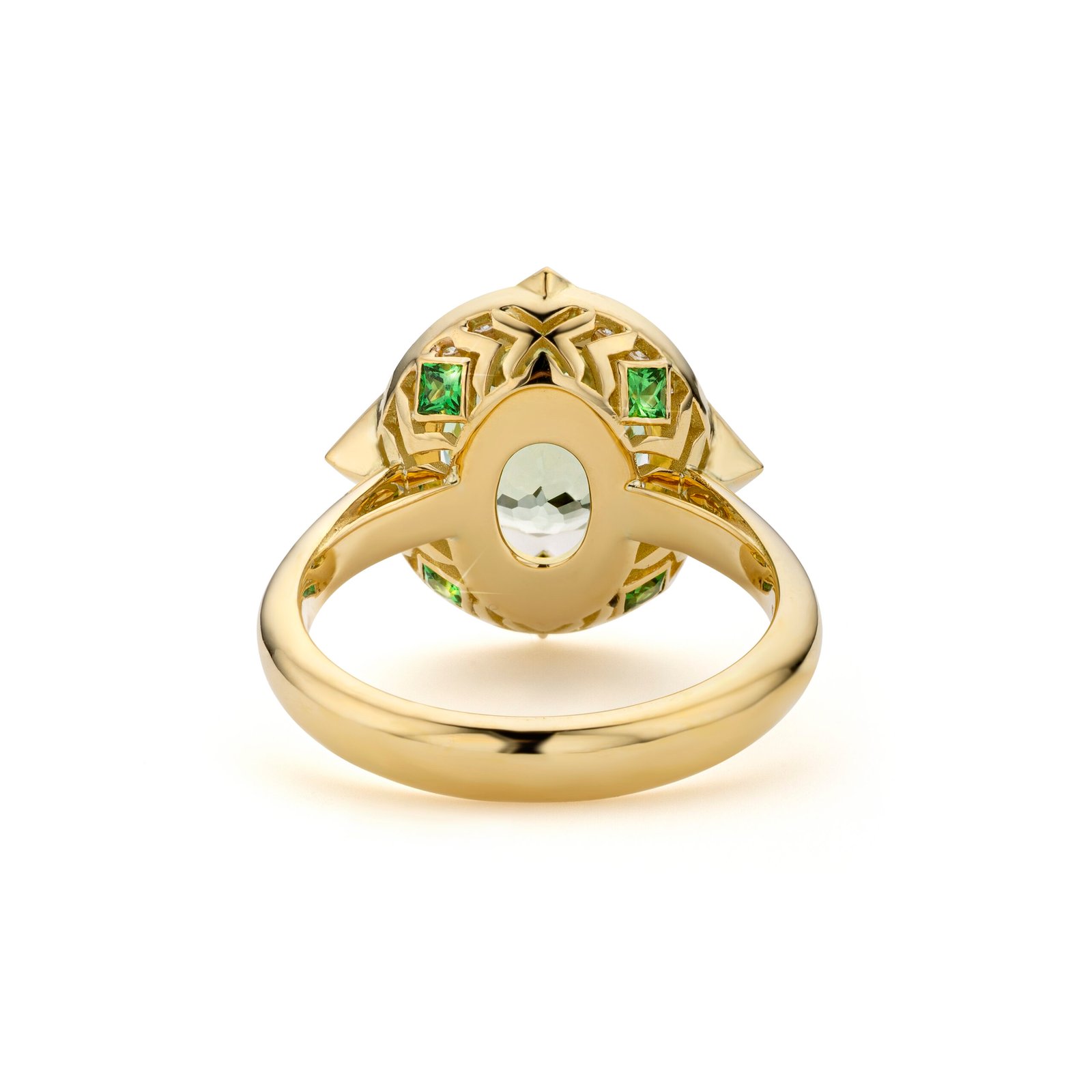 Verdale is a striking yellow gold ring centered with a luminous oval green tourmaline, encircled by a halo of brilliant diamonds and accented with vivid tsavorites in a geometric arrangement. The rich green tones and intricate setting create a bold yet refined statement piece. Perfect for those who appreciate vibrant color and distinctive design.