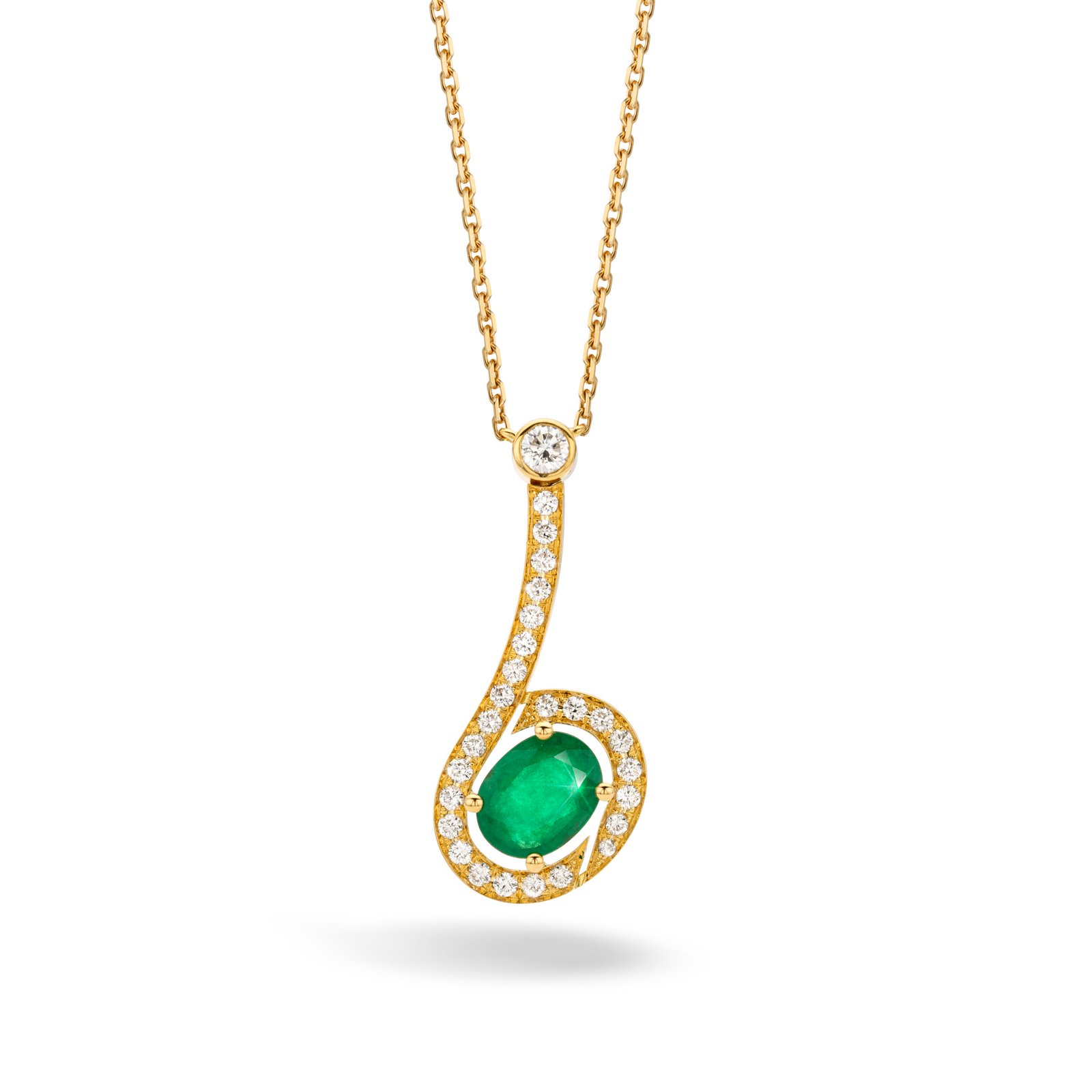 Mollis necklace is crafted in yellow gold, showcasing a vibrant oval emerald framed by a halo of brilliant diamonds in a graceful, refined setting. The delicate design highlights the vivid green gemstone while adding a subtle, radiant sparkle. Perfect for elevating everyday elegance or complementing a sophisticated look.